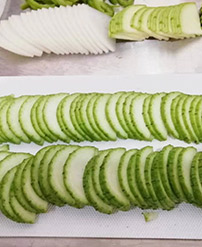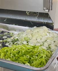 切菜機具備雙調(diào)頻功能,一端是切葉菜類,如長蔥,蒜苗,韭菜,芹菜,白菜,青菜等,一端是切球根莖類,如蘿卜,土豆,紅薯,芋頭,筍,洋蔥,茄子,蘋果,生姜等。根莖部分可切片(厚薄度2-10毫米可選),根莖部分切絲(2-10mm方絲可選),根莖部分切丁(8mm,10mm,12mm,15mm,20mm),葉菜部分切段切條(長度1-90mm可調(diào)),具備雙調(diào)頻功能。